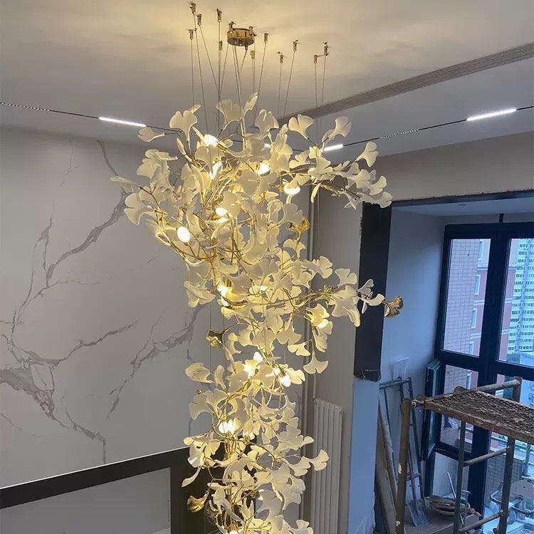 The Ginkgo Chandelier with its unique and beautiful shape, is inspired by the elegant aesthetics of nature and brings a sophisticated and serene atmosphere to your room. The new generation is made of high-quality composite material with ceramic texture material and is carefully frosted to enhance the texture. It symbolizes luxury and refinement and elevates your staircase environment to an unparalleled height. An indispensable piece of art for your room decoration, perfect for living room, foyer.